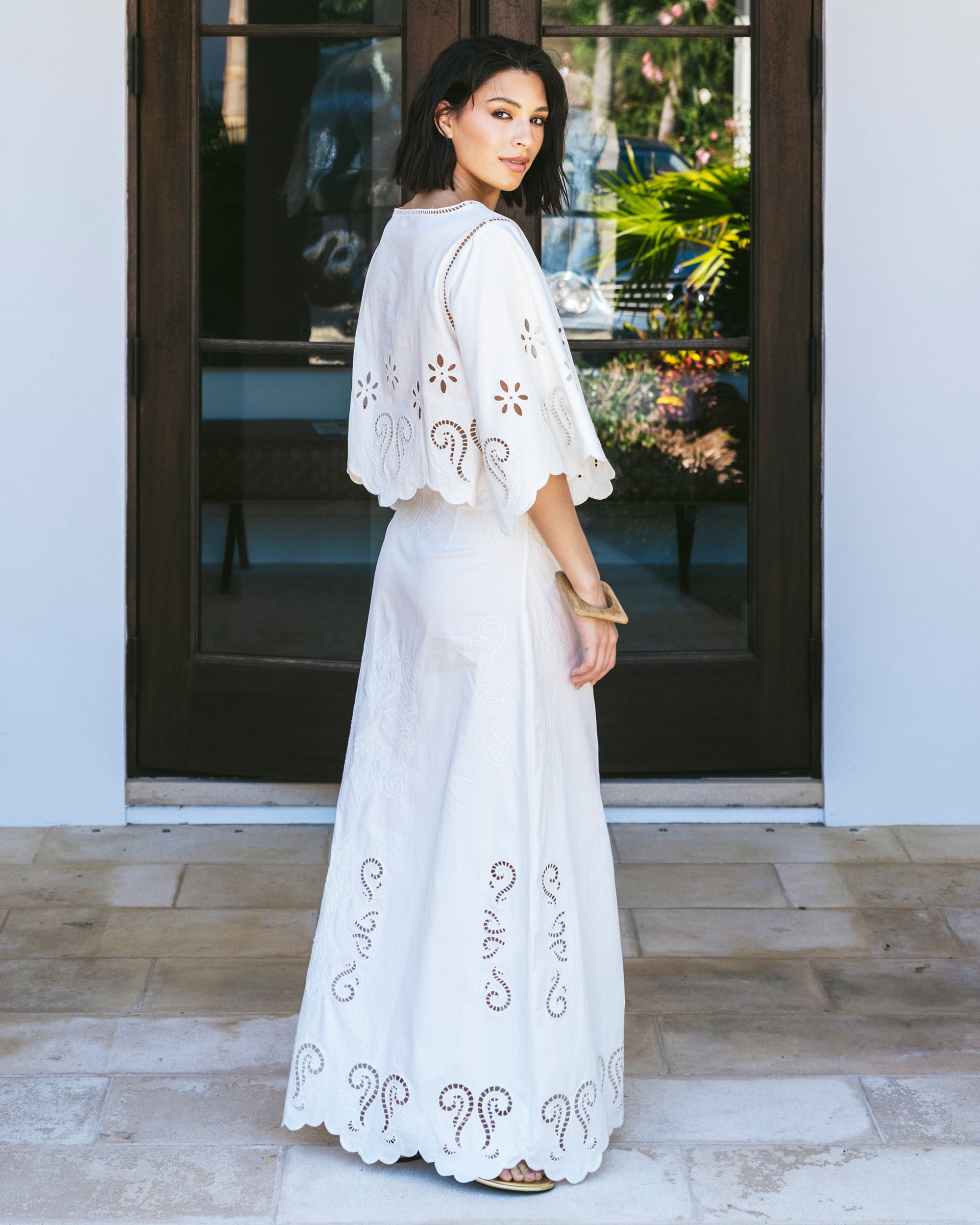 - Embroidery and cutwork detail throughout