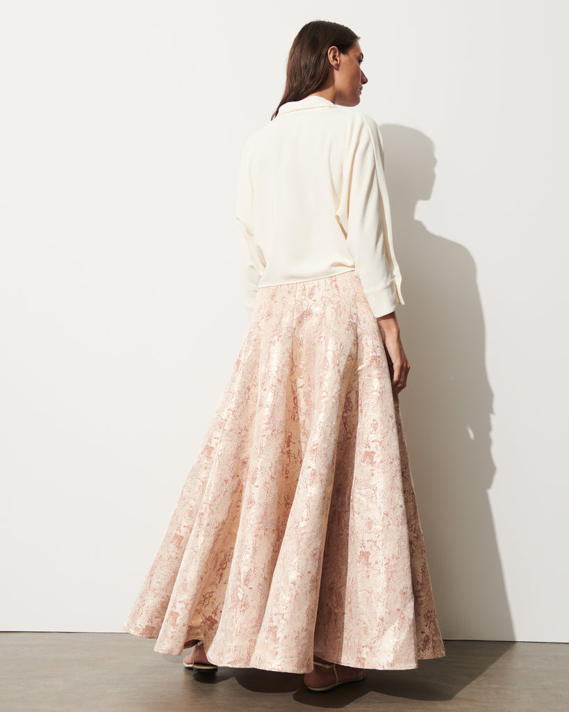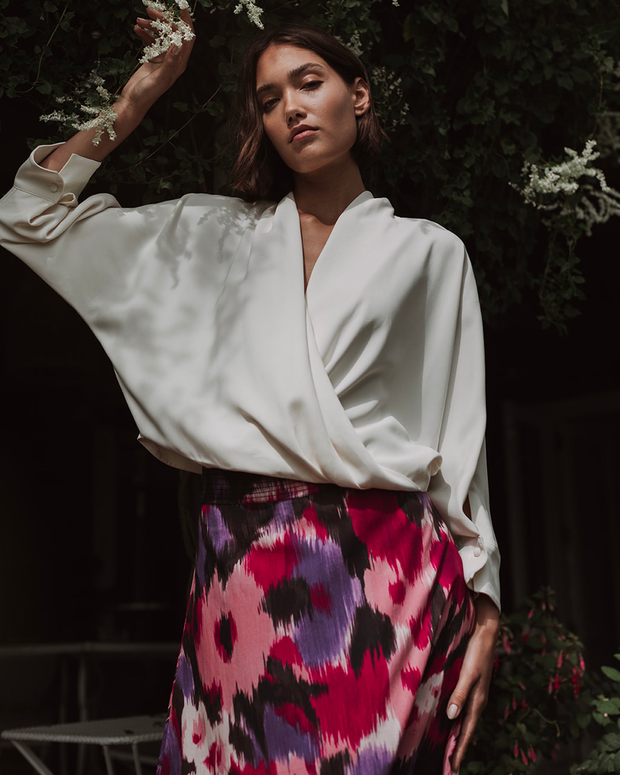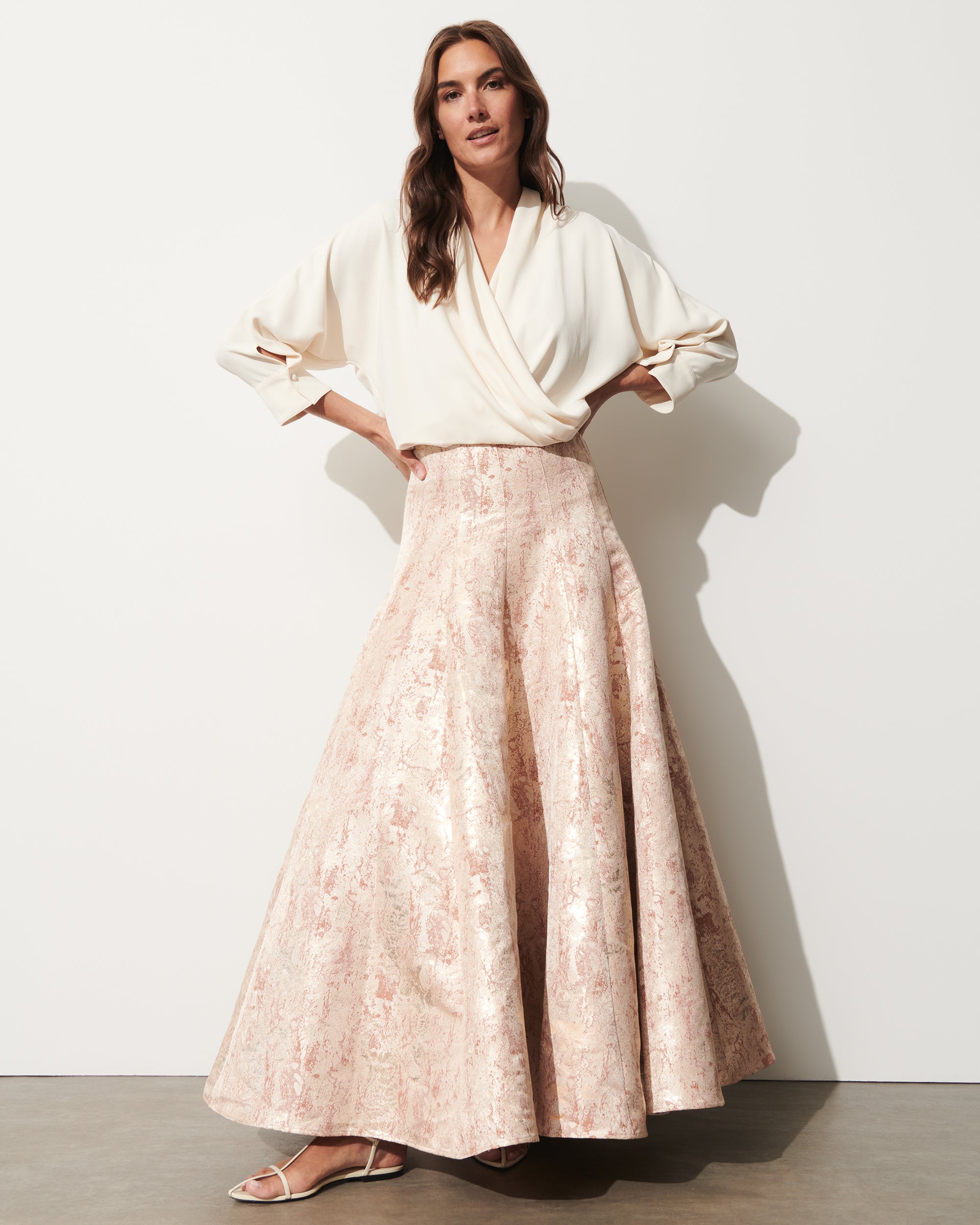 Made up in a luxe matte crepe, this elegant wrap-style surplice top features a dolman sleeve, covered button cuff detail at the bracelet length sleeve, and a draped, cowl-like neckline.
