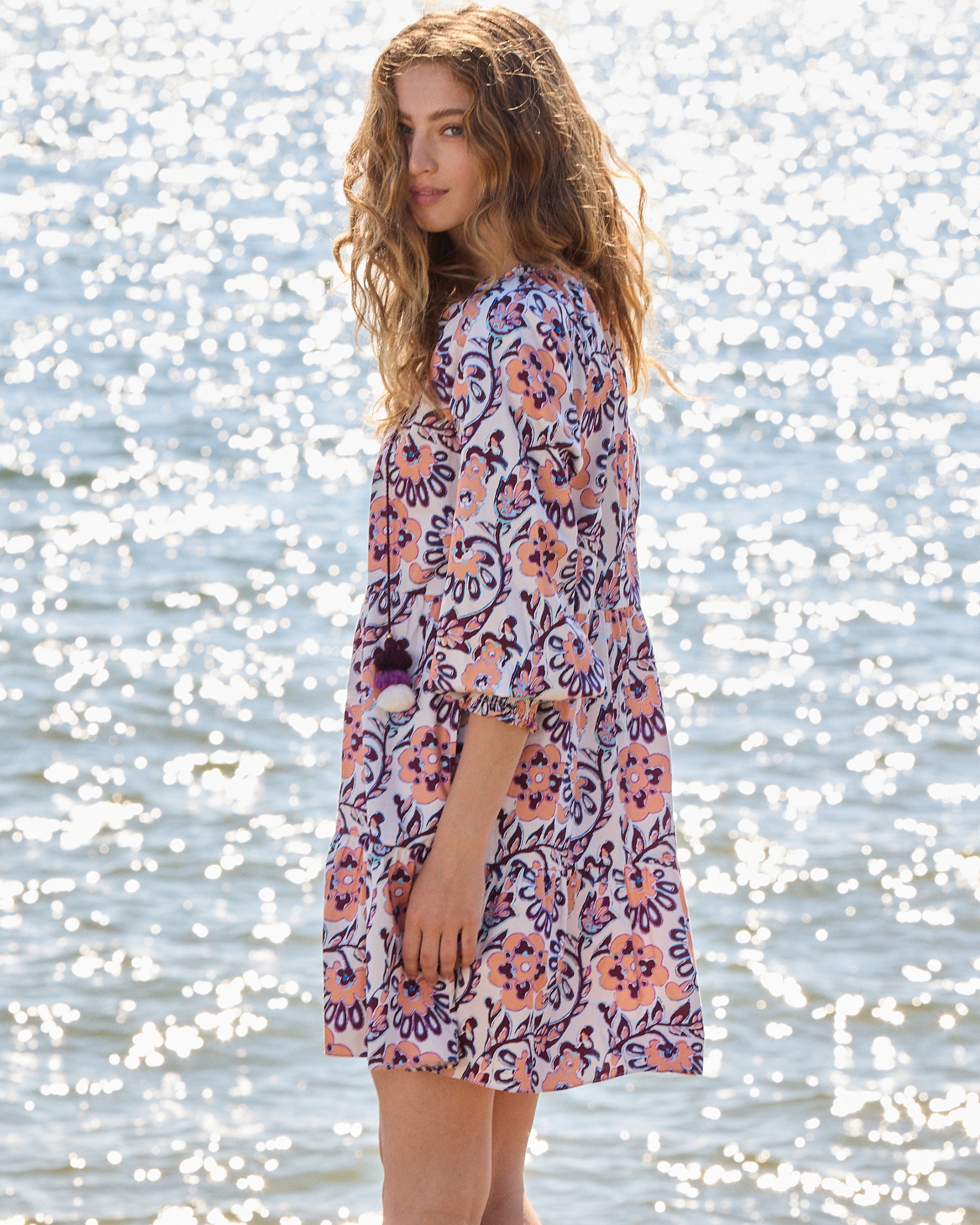 - V-neckline with baby ruffle and tassel detail
