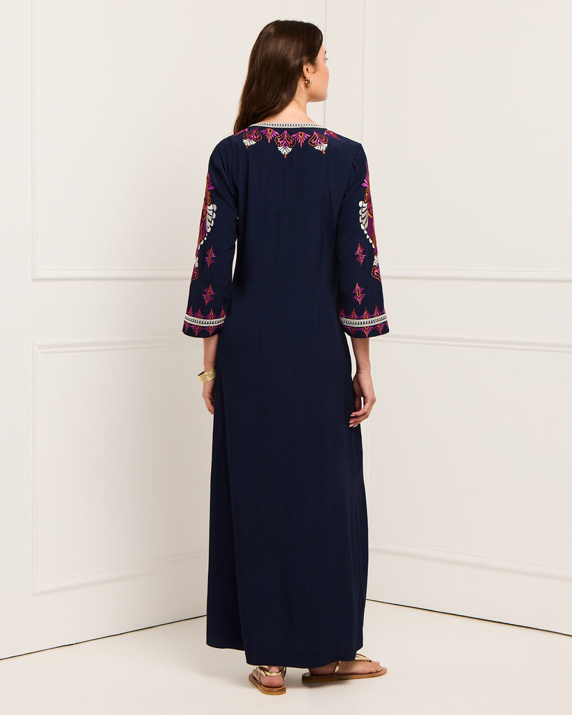- Three-quarter length sleeves with embroidery along arms and around cuffs