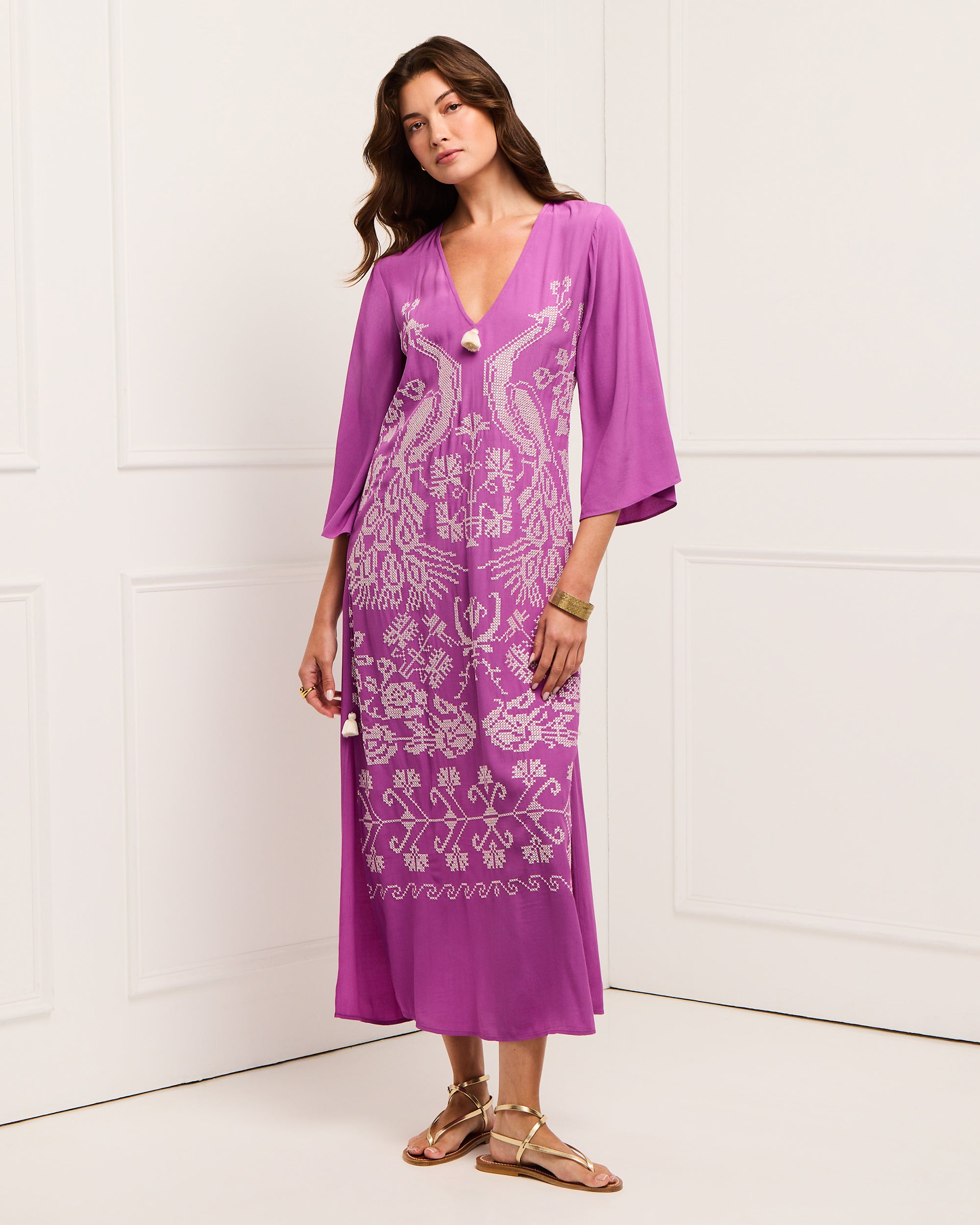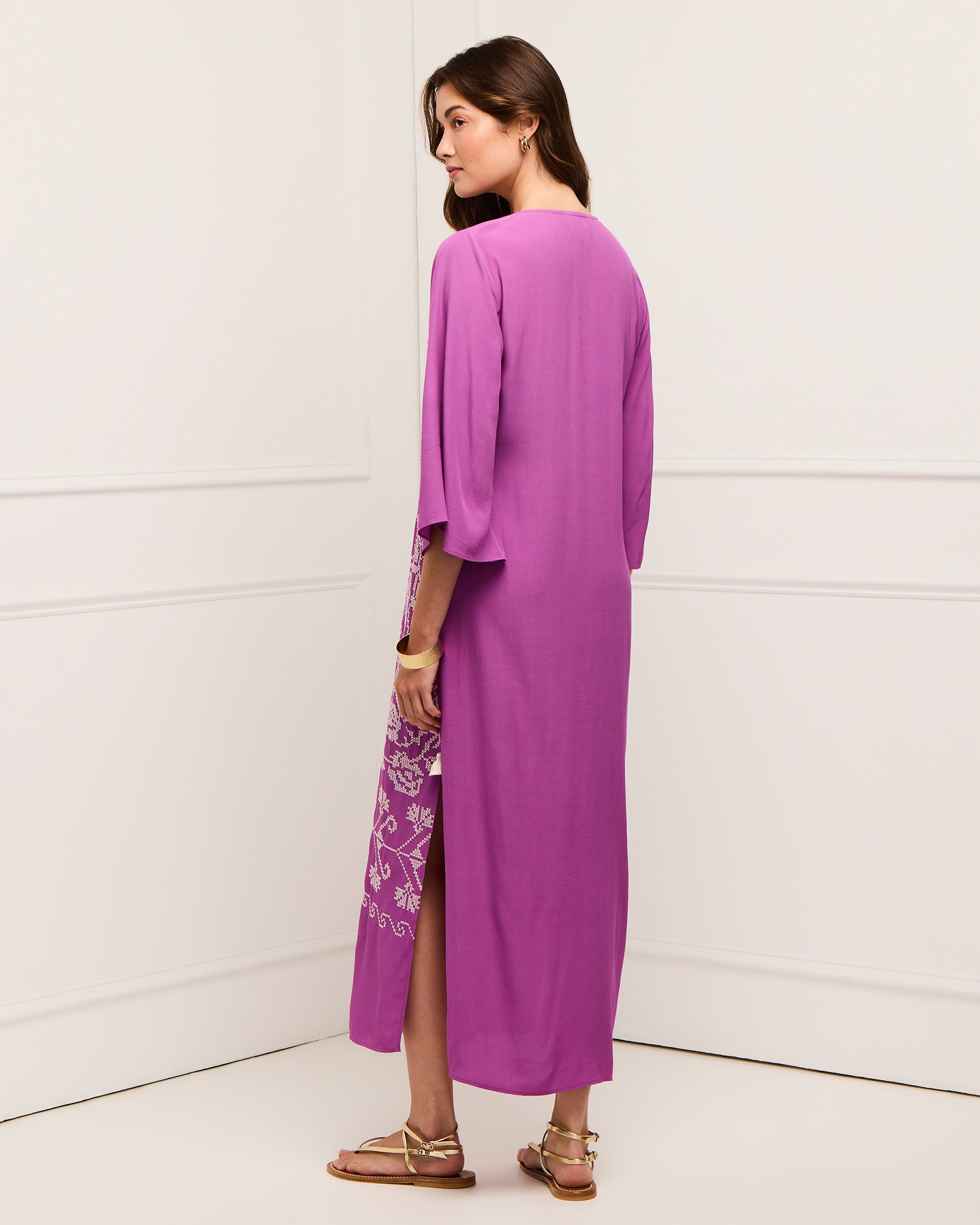 - Elbow-length flared sleeves